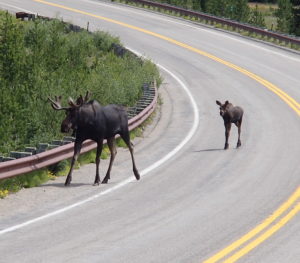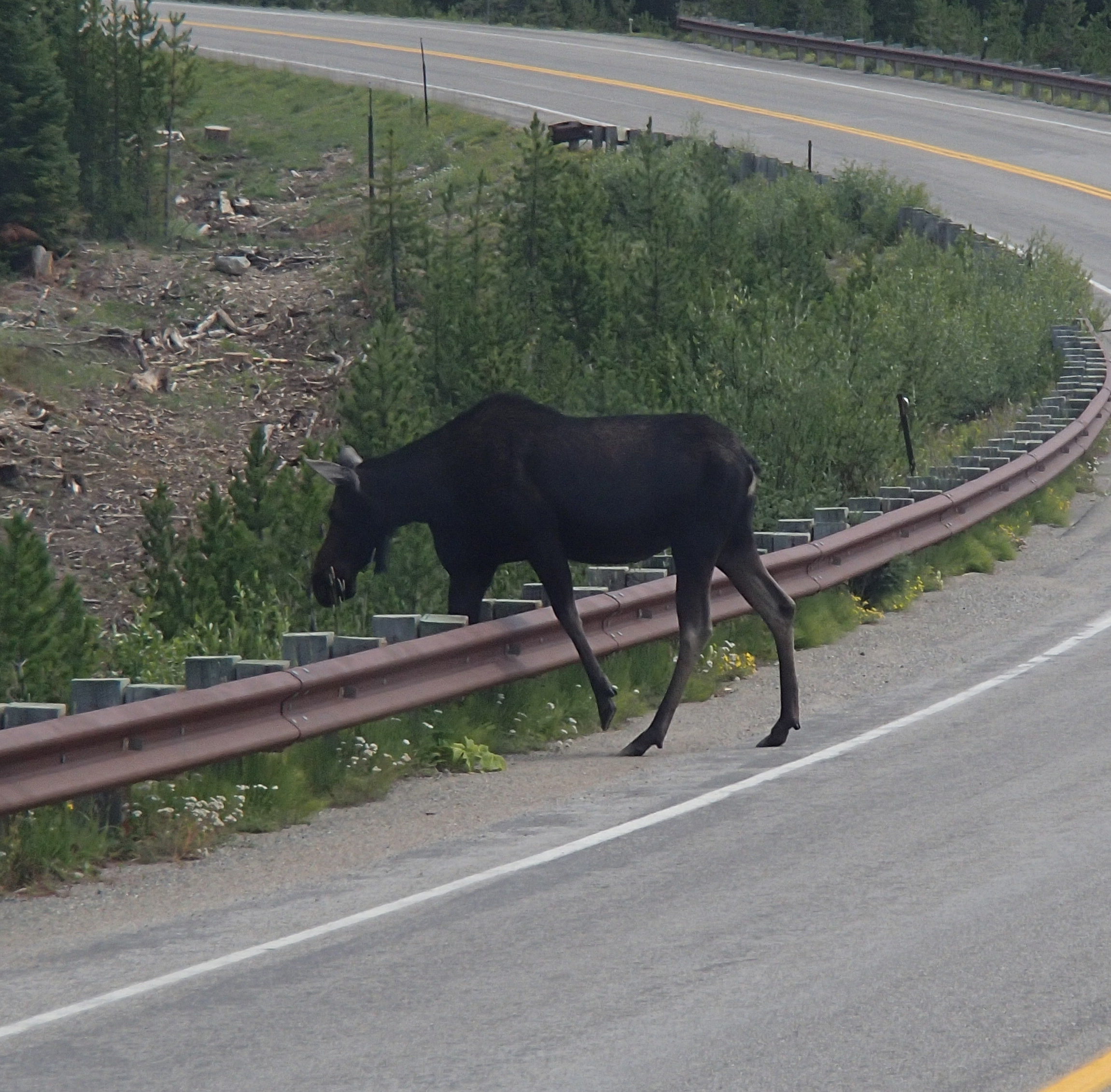 After I snapped a couple of shots, we spotted a cow moose with a ‘small’ baby coming out of the trees. Mama didn’t like us, we could tell that from how she locked eyes on us and put her ears up. Guard rail or no, we retreated. After we were safe in the truck, Karl turned around so that we could drive by again. It was at this point that they decided to cross the road. You can picture me now, heart pounding, and smiling ear to ear as I snap pictures.