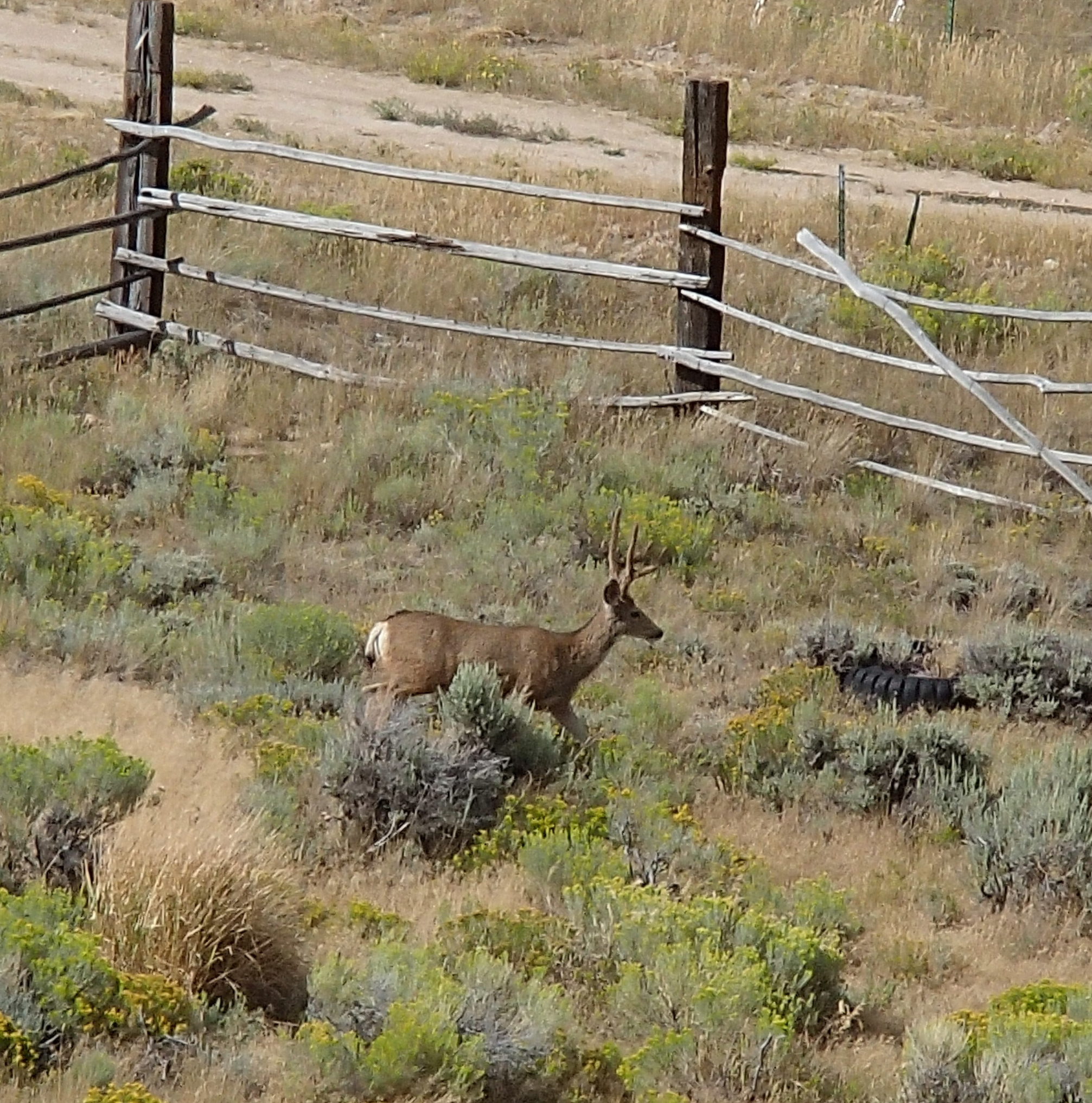Deer come next. Nearly every time I see a deer I think, “What a nice gift.” Deer are also quite prevalent and are in town (especially in Encampment and Medicine Bow!), on the plains, and in the mountains. They seem like kind souls somehow, and I love to watch them bounce over fences. They often stand still for portraits, though this week we saw a HUGE buck with a massive set of antlers, and I just stared and enjoyed, no time for the camera. Here’s one of four bucks who hang out on the outskirts of Encampment, and who walked through the yard when we were enjoying a fish fry with friends: