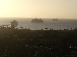 Last week, we witnessed another kind of traffic anarchy. Since our recovery from the ladies started, we’ve had a Carnival ship docked at Frederiksted Pier (just below our house). It is where most of the lineman and FEMA and other emergency support people from off-island are staying. Alongside the cruise ship-turned floating apartment complex, there is a tender ship also at the pier. Add to that several private sailboats and catamarans plus a few dive boats and some fishermen and the area around the pier is a busy place. Then, last week, we had two cruise ships full of tourist dock for the day. To make room, the Carnival floating apartment building left – it pulled up anchor and went on a small cruise. The tender moved aside and forward, and both cruise ships docked side my side at the pier. It was a beautiful day and I hope the visitors had a great day. About 5:30, I watched as the Carnival ship made its way back toward its home (I’m sure there were tired linemen waiting pier-side to get a shower and dinner after a long day.) The two cruise ships honked their big horns and started moving and the tender pulled out from the pier. All fishing boats, sailboats and the dive boats made a quick exit as these huge ships began maneuvering, and Karl and I sat on our front gallery and enjoyed the show. It didn’t take long for everyone to get sorted out, with the help of the pilot master being ferried between the big ships to help. One cruise ship went north, one went south, the Carnival apartments tied back up as did the tender, and a slew of tired linemen were soon happy in their rooms and the sun settled into the sea for the night.