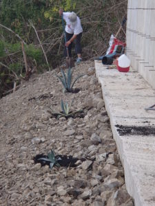 Gardening is a lesson in hope. What we had on our property, before the hurricanes precipitated our horrid landslide, was a verdant green slope of rainforest. Thanks to Maria and what we had to do afterwards, much of that expanse of property was converted into an ugly slash of rock, debris, and concrete. It has been an unsightly and stark reminder of woe. A vivid image of our worry and discouragement. Now that the construction on the retaining walls is complete, we’ve embarked on a mission to reclaim the area for beauty. Easily said, lots of sweat and blisters to attain. But. On Friday and Saturday, Karl and I toiled – and it was a lot of toil – to smooth out one of the terraces that was created between two of our three new retaining walls. The first job was to remove the construction detritus – used nails, pieces of concrete forms, slags of concrete as well as dead wood and branches. Next up was working with rake and shovel and hoe to smooth the area out and jettison or move the biggest rocks. (The whole area is mostly rock, but the biggest ones had to be dealt with!) Then began the fun part: a trip to the plant store to buy plants, then back to the terrace to get them in the ground.
