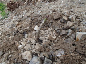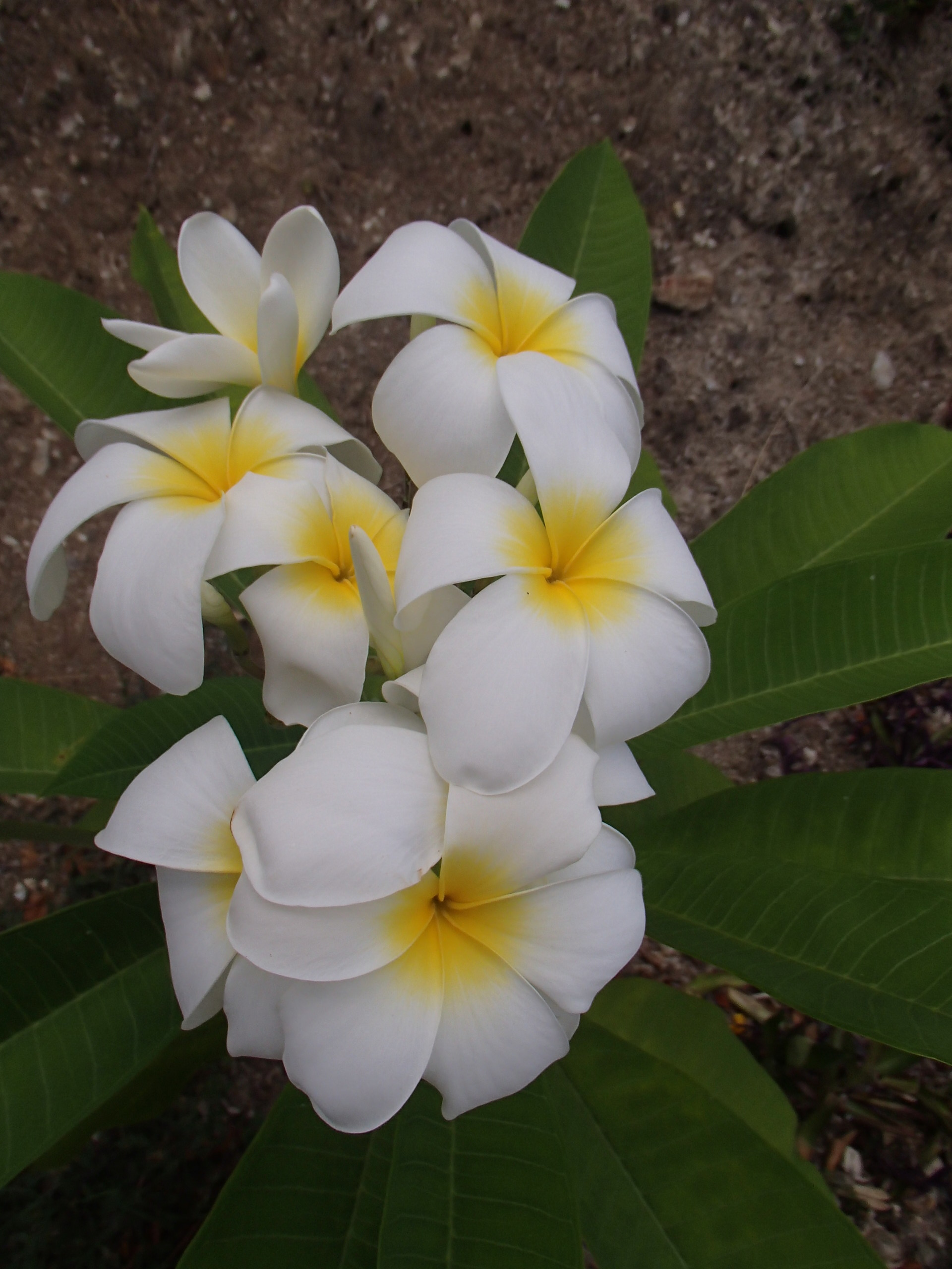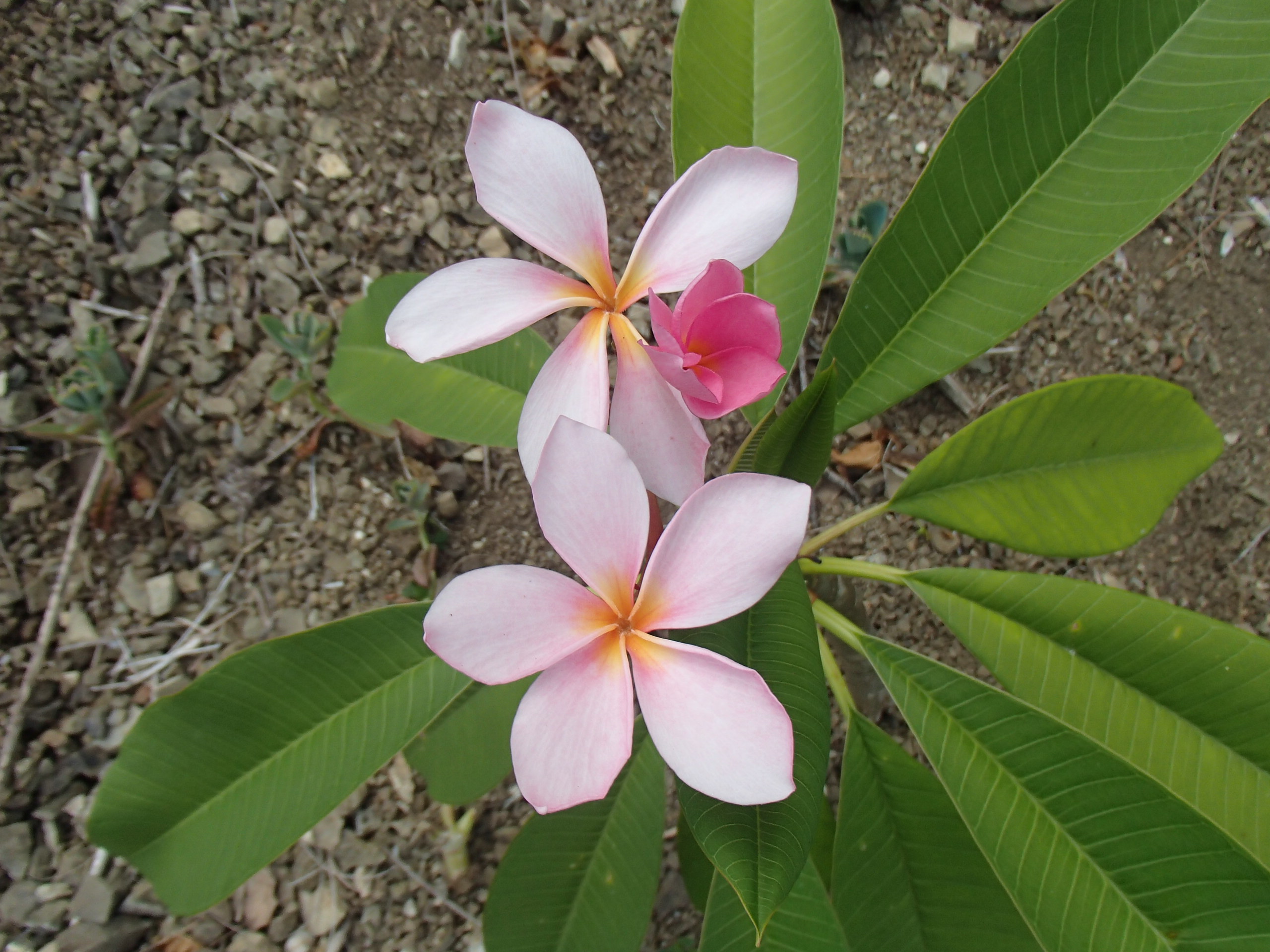 As sort of an afterthought, because I had a little room left on that terrace, I also planted two frangipani cuttings that my friend Barb gave me. To call them cuttings is generous. They are just bare sticks with a few funny looking points at the top. I have high hopes for these little guys though, because, if they grow, they will become trees that produce amazing, sweet smelling flowers. The coolest part about frangipanis, though, is that I won’t have to wait for the entire tree before I can enjoy the flowers, because they bloom quickly. I know this for a fact because last year about this time, I planted two other cuttings. In just a year, one has grown to about four feet high and is currently topped with a hat of white flowers with happy yellow centers. The other, which I stuck in the ground by our driveway and I don’t give as much care to, has only grown about six inches, but it is adorned right now with gorgeous pink flowers. So. Hope abounds. The danger of our house sliding down off this hill has been (we hope!) averted, and a blank canvas awaits our labor and vision. One terrace is done, two more need our attention. I’ll keep you posted.