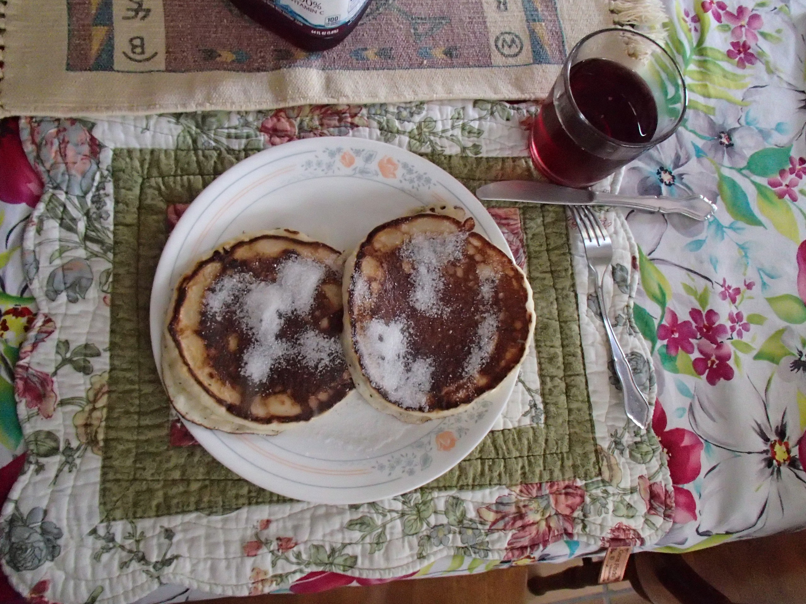 I love pancakes. Two circles of doughy, warmness fill my belly and satisfy me like no other breakfast. I like them slathered with melted butter and sprinkled generously with white sugar. (Syrup makes them soggy and, well, the taste of maple – yuck.) When we go out for breakfast, I order crepes or omelets or eggs benedict, but here in our home, nearly every morning around 10 o’clock, Karl says to me “What would you like for breakfast?” It’s a game we play. He asks, then I stammer and pretend to consider before I answer, “Pancakes!”