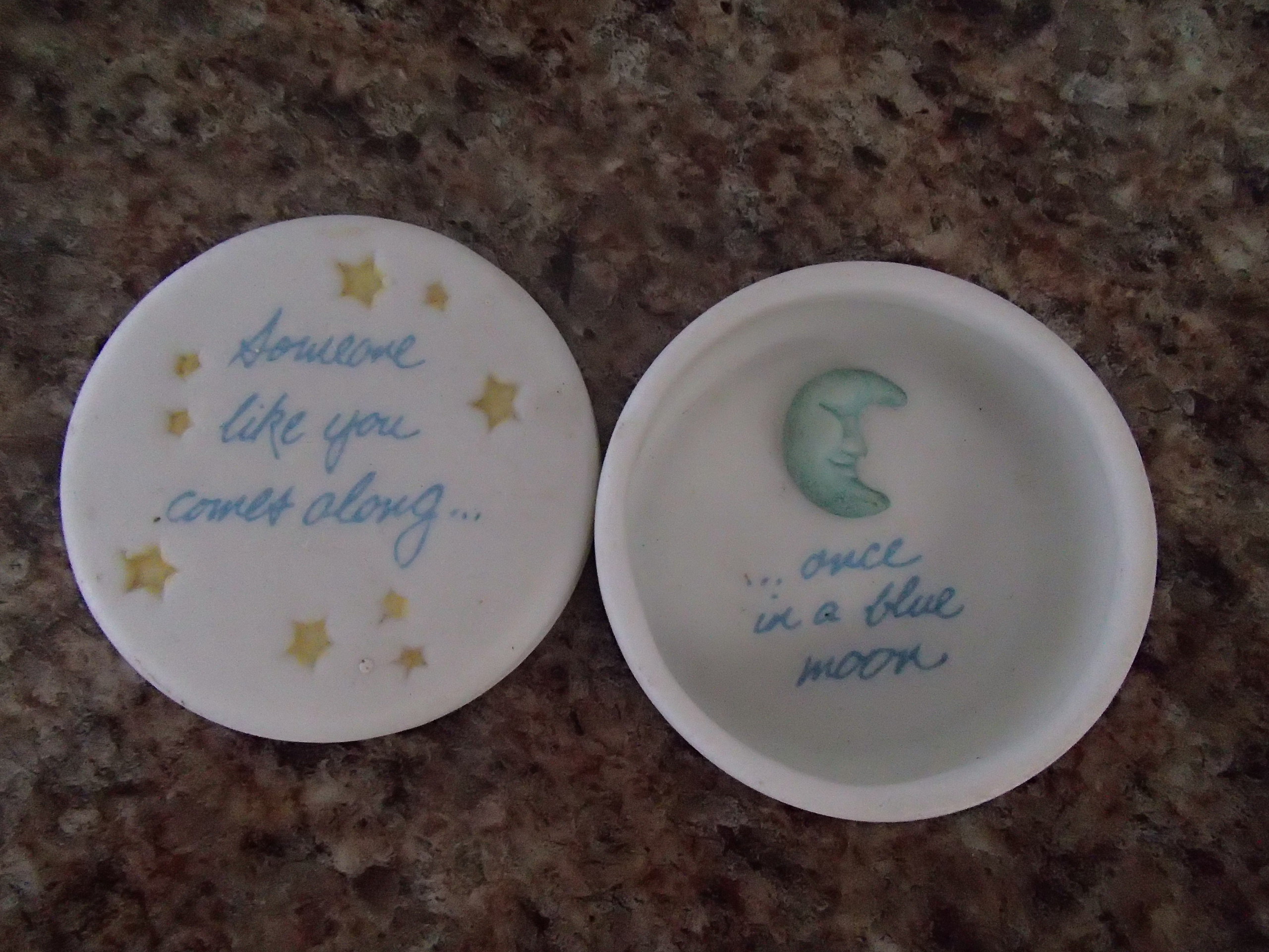 For example: my office bookshelves house books along with dozens of turtles. Ceramic, crystal, wood, stone, wax, hand carved, realistic, artful, plain, colorful, old, or off the Hallmark store shelf. (I culled many out recently and threw a bunch away, but a substantial herd remains.) Every one has a story. This one was a gift from a first grader named Jessie, that one from a naughty fifth grader. This one that looks like a troll came from Santa Claus when I was very young. Beside turtles I have a collection of little boxes. This glazed pottery one that says “Someone like you comes along…once in a blue moon” was a gift from my friend Lynn.