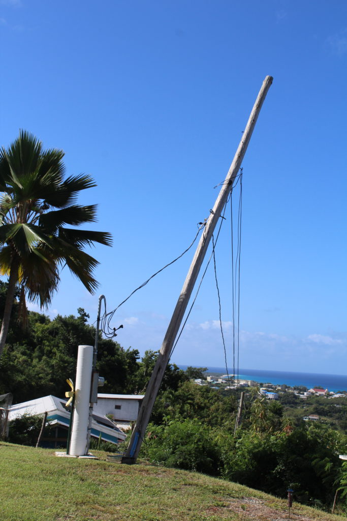 Hurricane Hugo did a lot of damage in 1989 on St. Croix. We weren’t here then, but we have lived with one remnant of Mr. Hugo since we bought our house. Our power pole lists at about a 60-degree angle. It looks as if it is reaching for the sea. Besides looking kinda funny, it often worries Karl that it will fall down, especially since the pole is also very old and cracked.