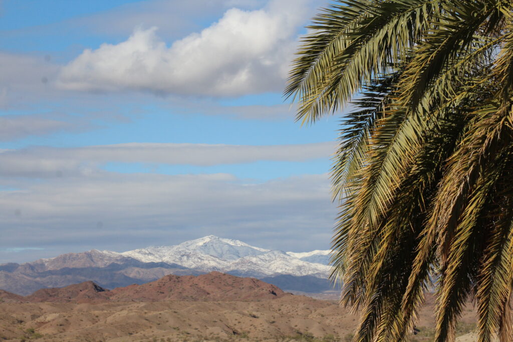Surprise four: We came south to get out of the cold, and it certainly is warmer here, but it did rain all day yesterday, and we woke up today to see snow on the mountains around us. We stopped for a few minutes on the shore of Lake Havasu, and I just couldn’t help feeling joyous at the contrast between the palm tree on the bank of the lake, and the stunning mountains covered with last night’s snow in the distance.