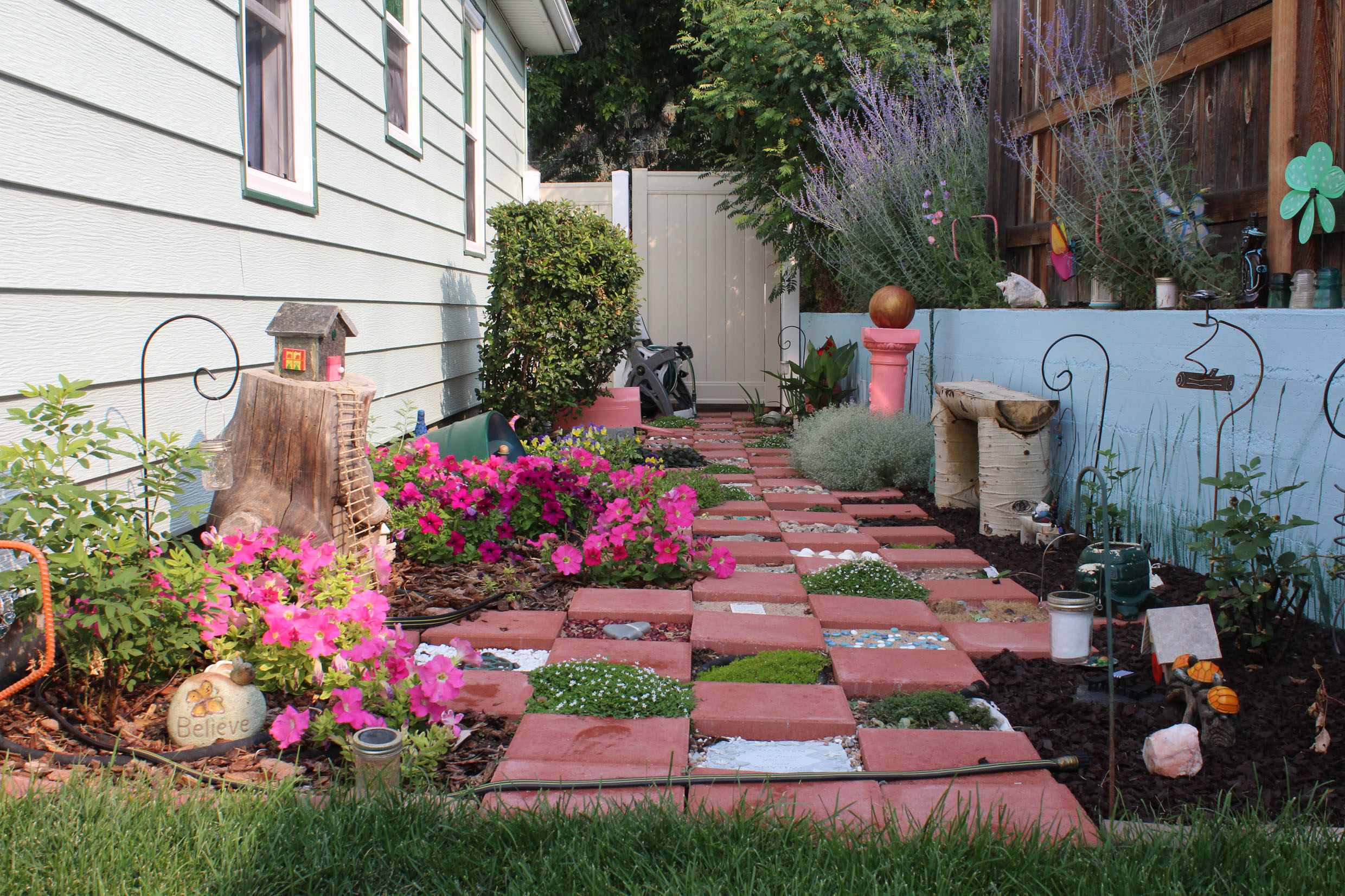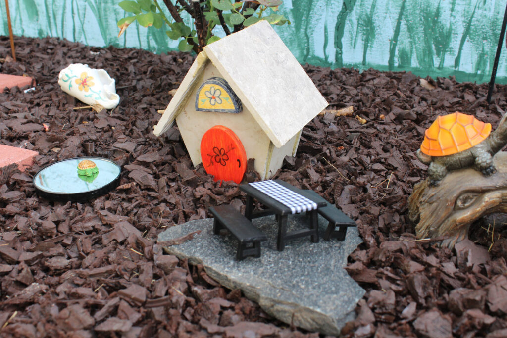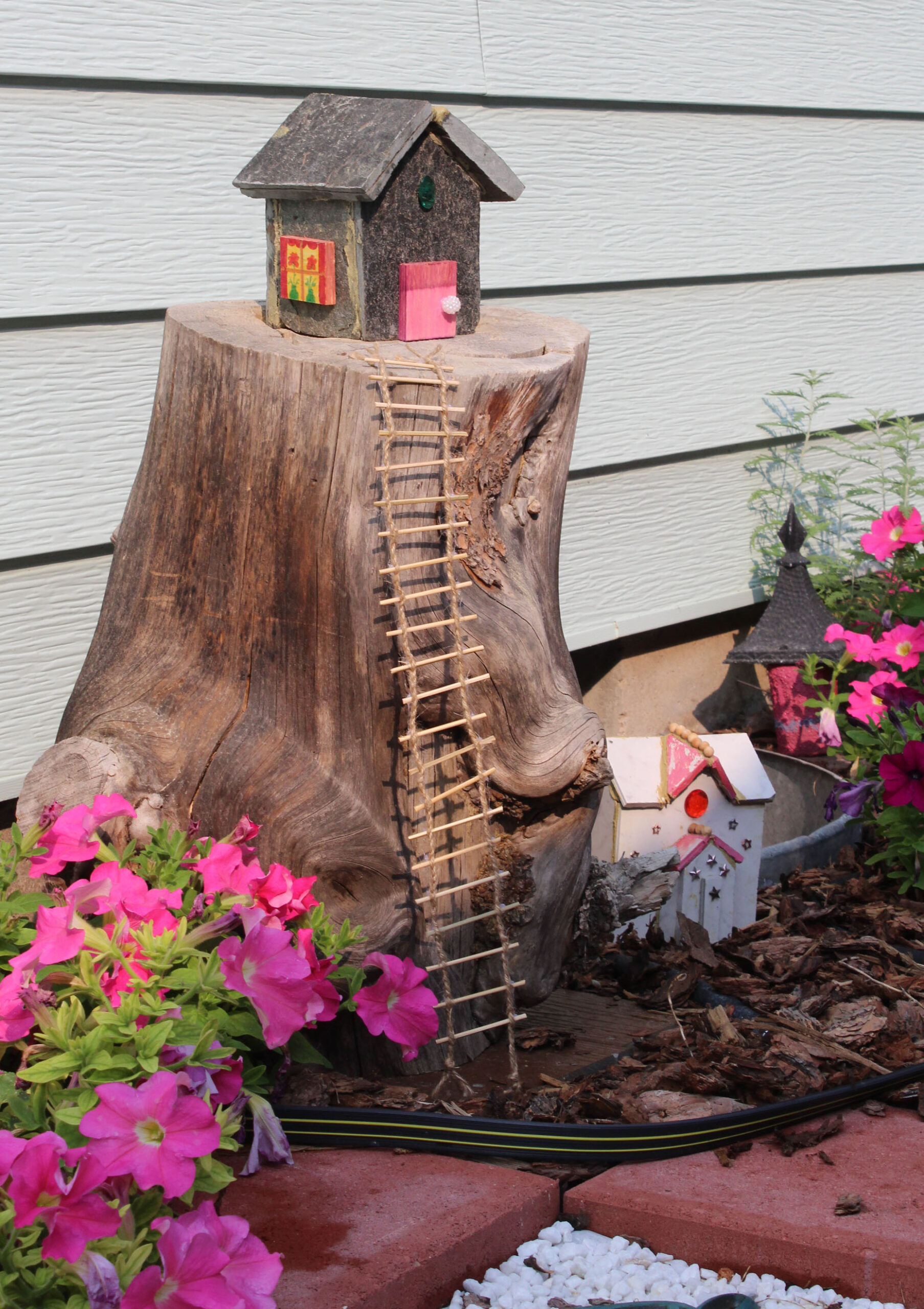 Three new fairy houses have appeared as well, these are made of rock and ceramic tile (the builder made them herself using the tile saw and gingerbread house patterns!), and they are elaborate domiciles for the upper crust of the garden’s fairy population. The grandest one sits prominently on a gnarled stump and while fairies fly, they welcome their grounded neighbors by supplying a rope ladder for visitors. All in all, the residents seem well satisfied with their community.