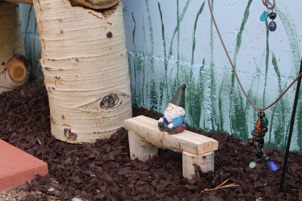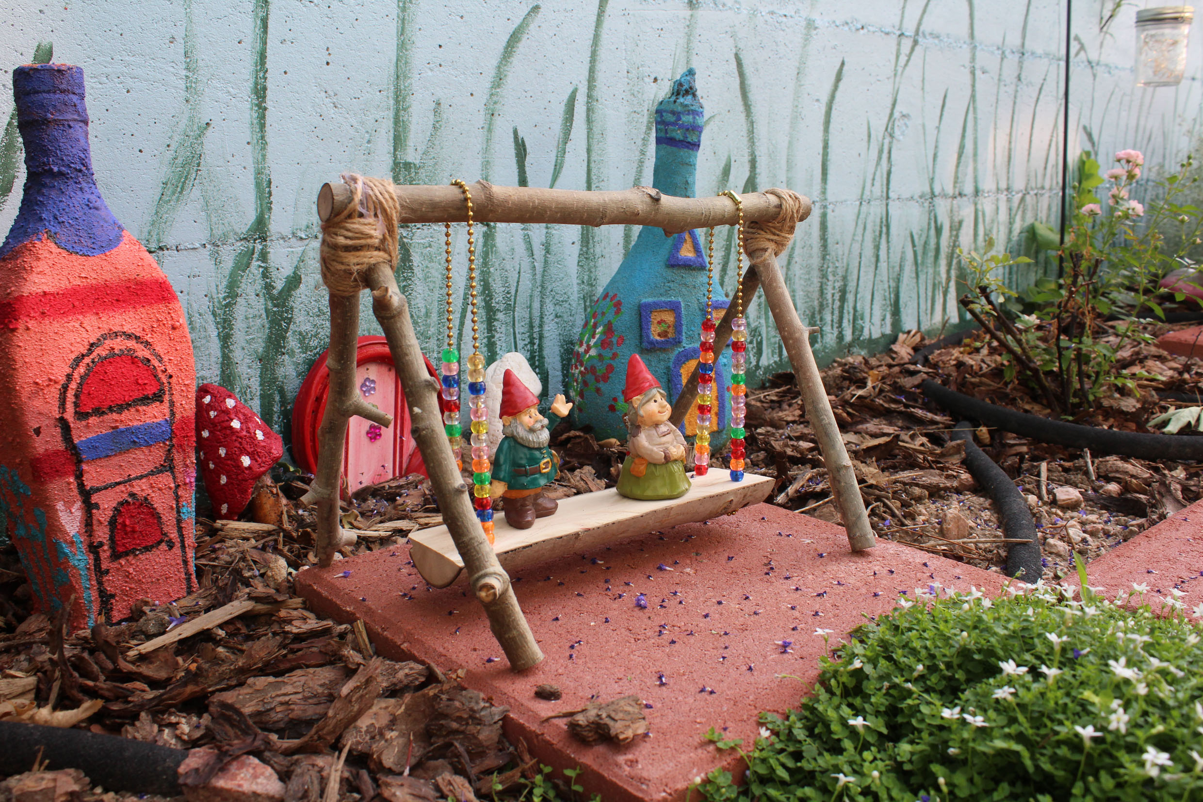 A family of gnomes has moved in. They especially enjoy spending their evenings hanging out together on their garden swing. The old grandpa gnome spends most of his afternoons, after he awakens from his nap of course, sitting on the miniature version of the people-sized bench Karl made.