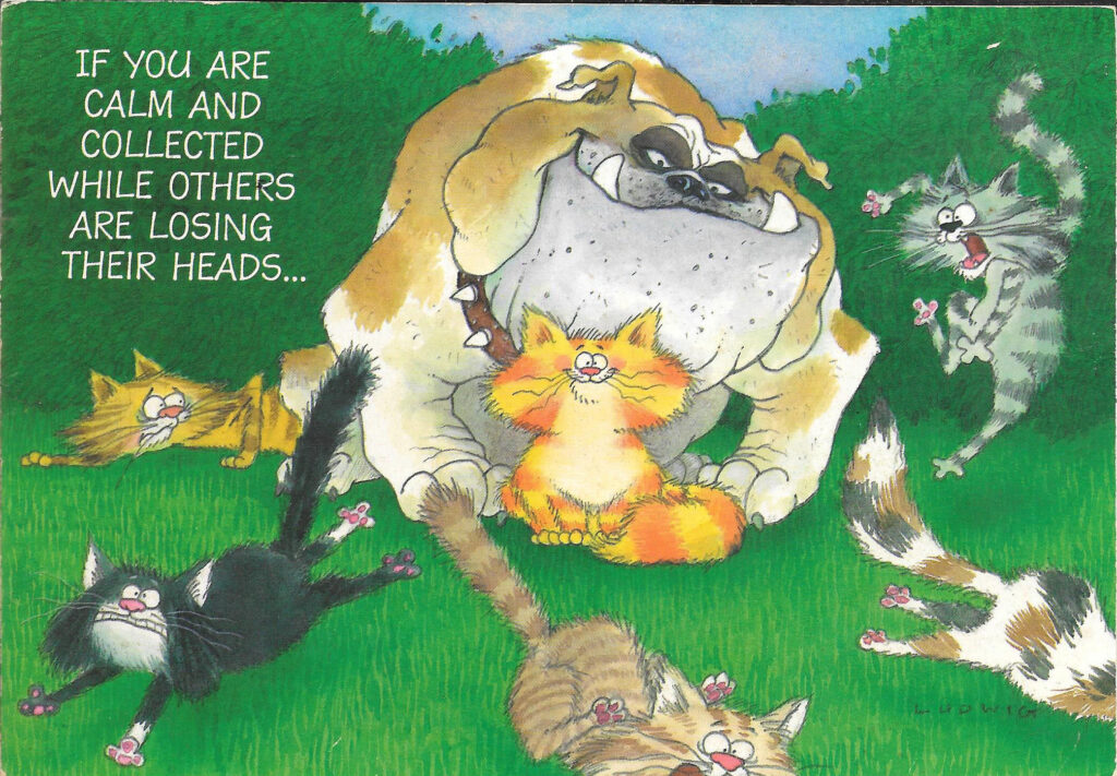 Years ago I bought a Hallmark card that I thought was funny in its lighthearted treatment of life’s troubles. The front of the card has a fluffy little kitten sitting happily and seemingly unaware of a huge, spike-collared, big-fanged dog right behind her. Other cats are running desperately for safety while she sits content. The front of the card says, “If you are calm and collected while others are losing their heads…” On the inside the sentence continues, “maybe you don’t understand the situation.”
