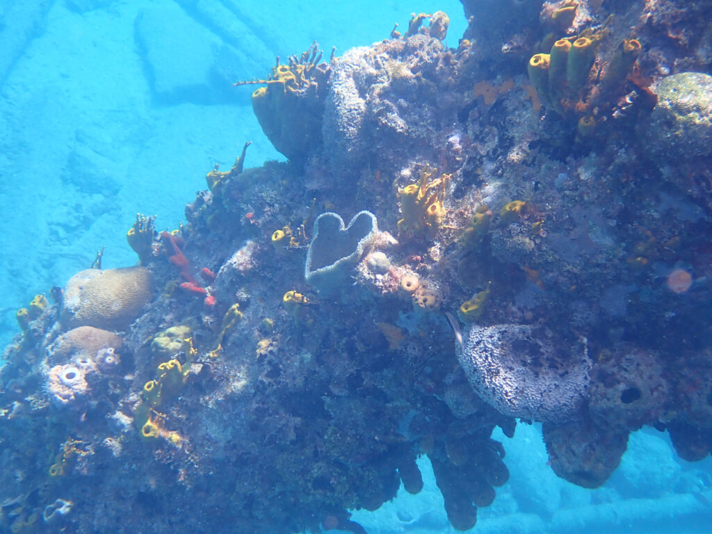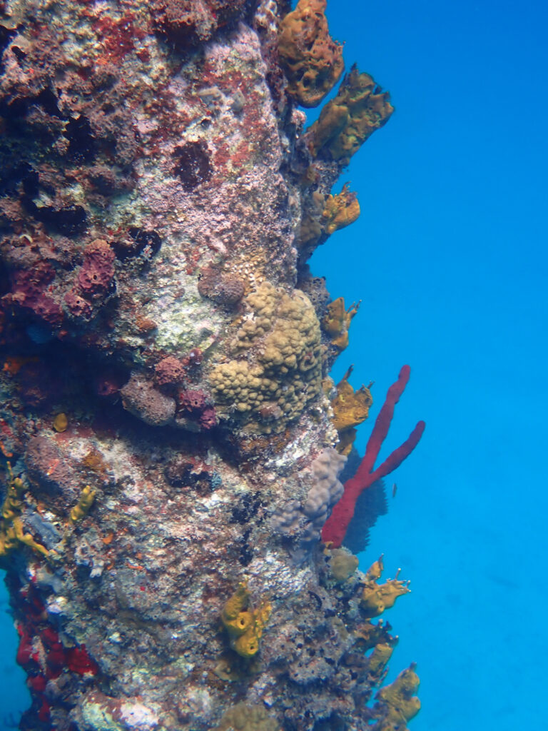 The two magnificents move away, leaving me to study all the life that clings to the cement columns. I’ve not the skills to name the uncountable species of sponges, anemones, and other plants and animals that call these columns home. My ability rests solely in observation, fascination, awe. I love the colors, the textures, the surprise of variety displayed in front of me. I stop kicking and float, watching my view change as the sun breaks through cloud and brine – acting like a spotlight to highlight something I’d not noticed before.