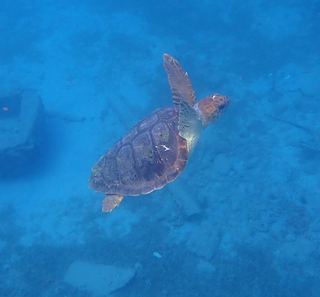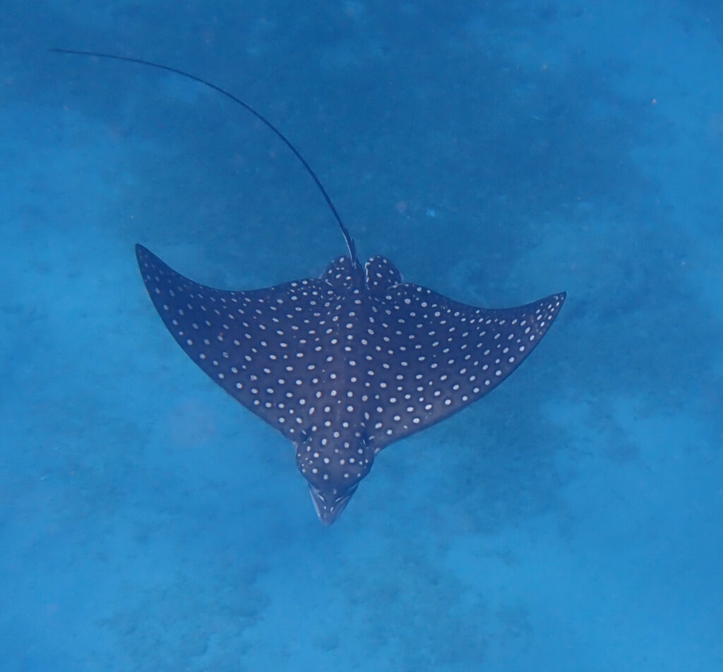 A loggerhead turtle, not common in St. Croix’s waters, played among the barnacled ruins of an old dock. He came up to breathe as I floated above him, surfacing not far from me before returning to his deep playground. As I watched the loggerhead regain the depths under the old dock, a spotted eagle ray ‘flew’ by. Graceful and sleek, the ray slid by effortlessly without heed of me.