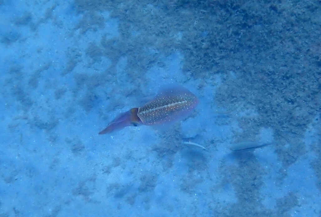 A small fish, I recognize its blue head and yellow body as a wrasse, darts out from a hiding place. A larger, more majestic blue tang swims by. Now I spy a squid, his odd propulsion looks like fringe ruffling in the current.