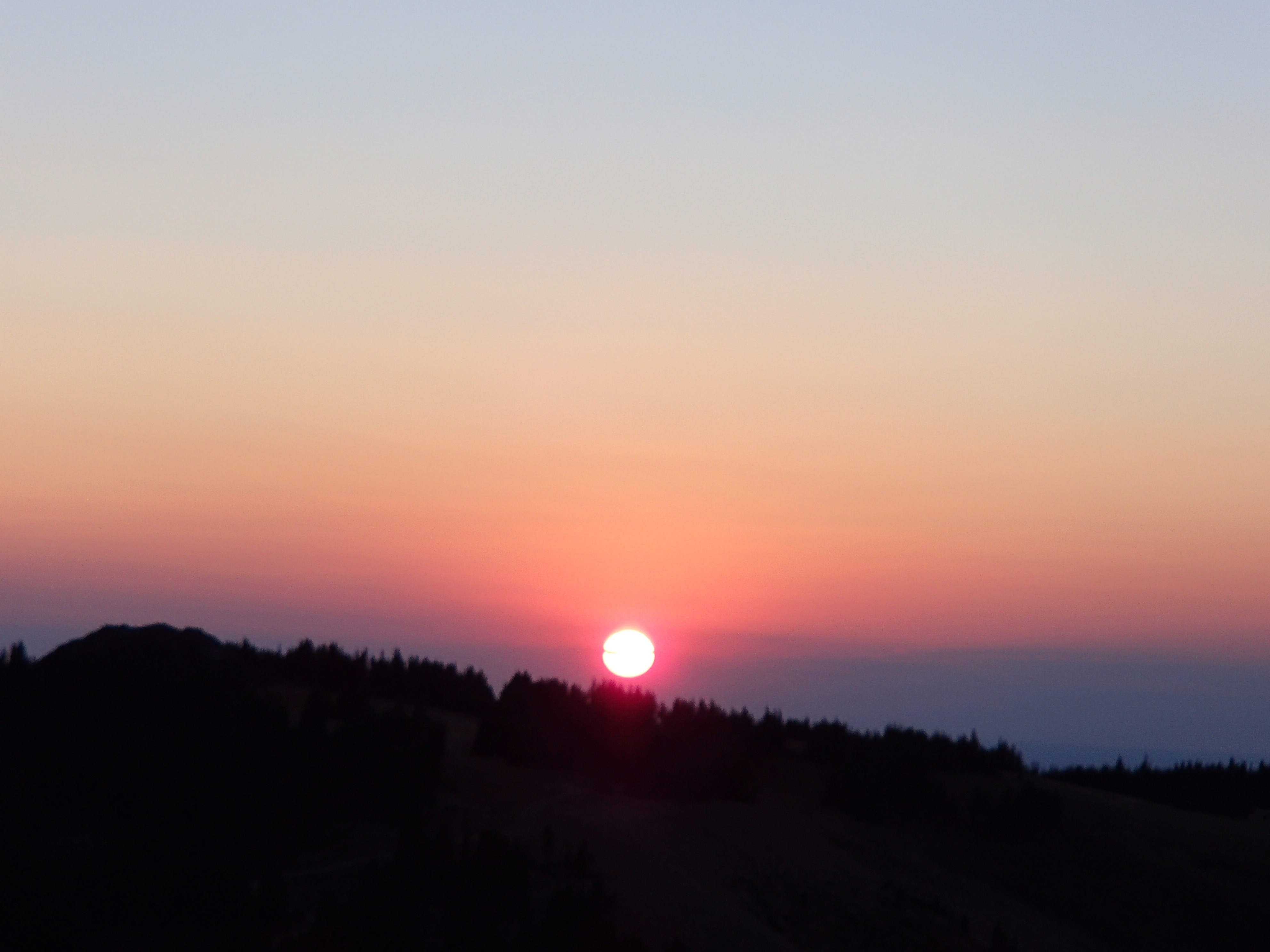 Just sitting on the top of Bridger to watch the sun set was worth the whole trip. Karl and I sat on the top of the world and listened to the wind sighing in the trees below. The sheepherder’s wagon was in a draw to the north and we could see the dust of the sheep in a clearing far below us. With all the recent and active forest fires in Montana, Idaho and Wyoming, the sun set itself into a haze of first pick and then finally into a blaze of bright red.