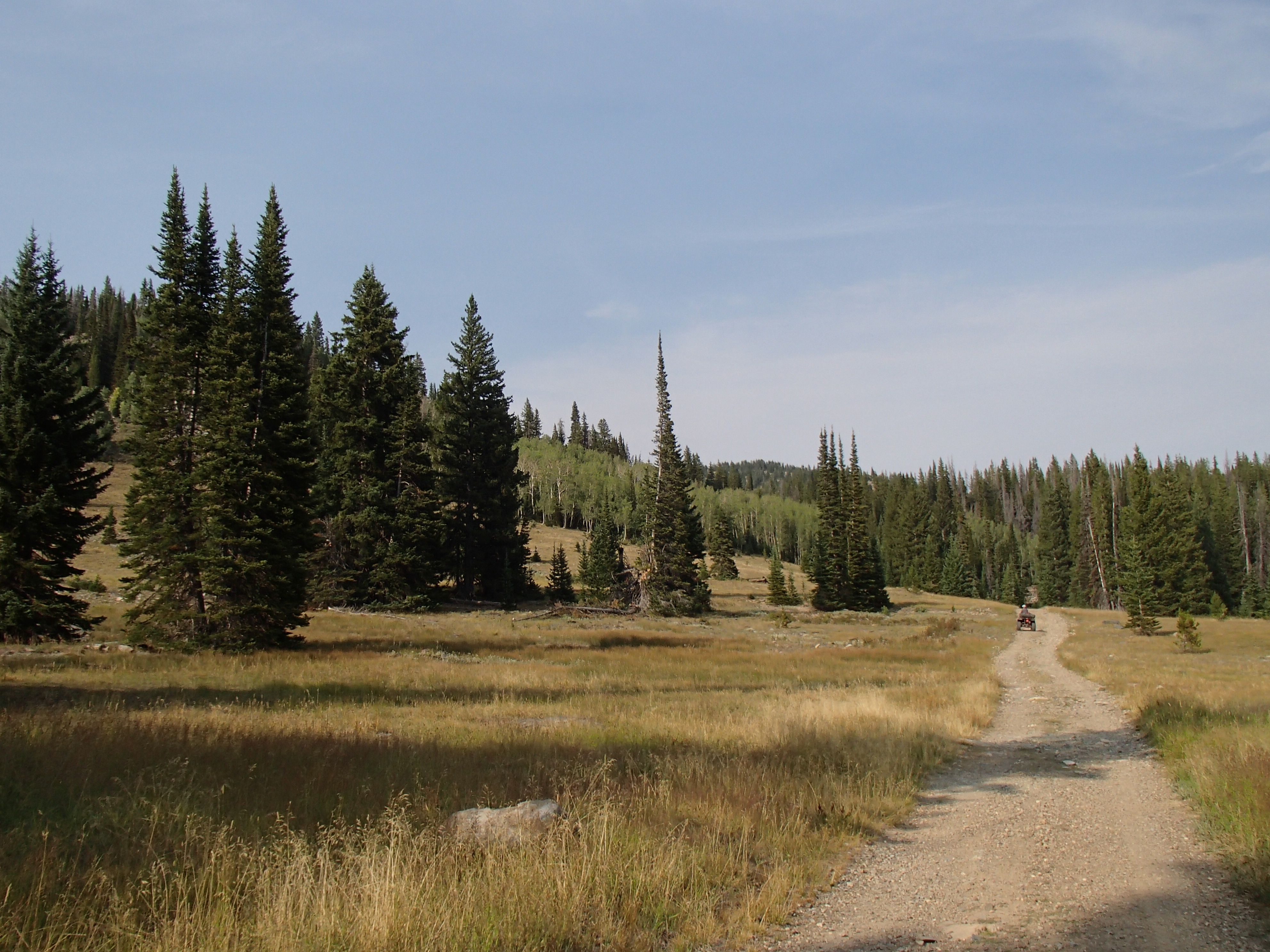 When we drove out of the driveway, we weren’t even sure where we were heading, knowing only that the mountains were beckoning and that we needed peace and quiet. We ended up in the Sierra Madres, up the mountain from Encampment, Wyoming, at a camp spot in the forest at the base of Bridger Peak. We arrived about an hour before sunset, so we hurried to set up camp and unloaded the four-wheelers. We tied the heavy coats on the machines and headed up. The road to Bridger Peak is pretty rough. It is about 3 miles of a two-track path full of rocks and wash-outs. A pickup truck can make it, but it’s much more fun on the four-wheelers.