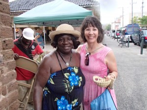 After the tour, we rested at an outdoor theater area and listened to and watched a woman named Zenobia Washington. She taught us about Gullah language and culture. Gullah is hard to explain. To understand Gullah, you have to know that when the slave trade began, slave traders got the people that they were going to sell into slavery in West Africa. Now, we think of West Africa as one place with one kind of people, but in fact, it is a huge area and the people that were enslaved spoke over 40 different languages and had about that many separate cultures, traditions, religions and life styles. Slave traders, on purpose, put people from many West African cultures on each slaver ship in order to keep them from banding together and resisting. It’s hard to form resistance to your captors if you don’t speak the same language as your fellow captives. When the enslaved Africans arrived in America, the greatest majority were brought first to Charleston. They were sold at the slave market, and sent to plantations throughout the south. Those plantations, according to Zenobia Washington, became those slaves’ “whole universe”. Think about it, if you were forced from your home, then stuck with a group of people, all strange to you, then sent to live the rest of your life somewhere as a slave with those people, what would you do? What they did was to meld all those 40 languages, plus English, Portuguese, French, Dutch and any other language that you were around into a new language. You’d take all your beliefs and traditions and mix them up with all the traditions and beliefs of the people you were around. The result, is Gullah. Zenobia made it very clear that “this was not a transplanted culture.” She explained it by saying that all the different ways of life were bleeding and sweating off and mixing together. She added that “the more you are around people different from you the less you stay the same.” I think that is really wise, and I’m going to spend some time thinking about that.